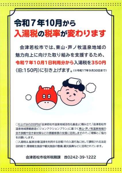 2025年10月1日より、会津若松市の入湯税が150円から350円へ引き上げとなります。