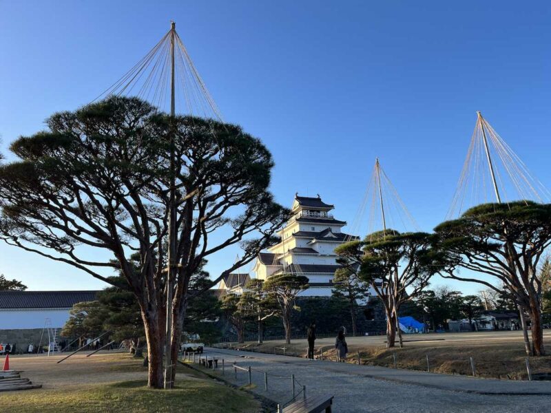 鶴ヶ城では冬の風物詩、雪吊りがほどこされ、
