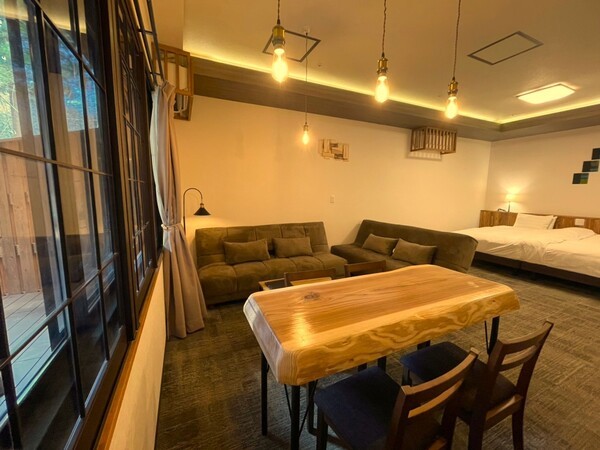 一室のなかにツインベッドやソファベッド、ダイニングテーブルを配した利便性を凝縮した造りでプライベート利用にも最適です。