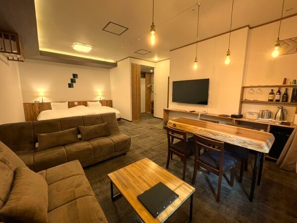 一室のなかにツインベッドやソファベッド、ダイニングテーブルを配した利便性を凝縮した造りでプライベート利用にも最適です。